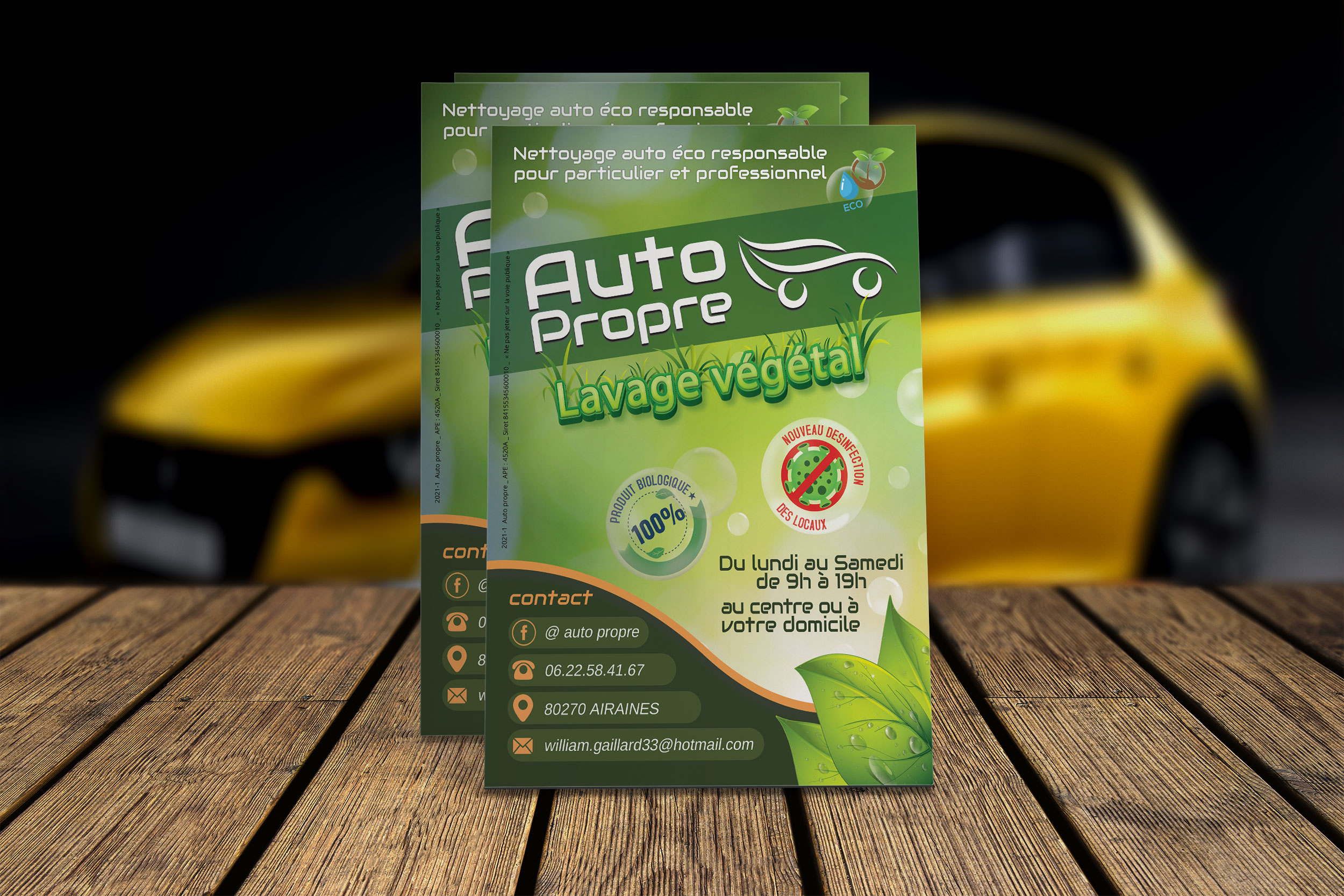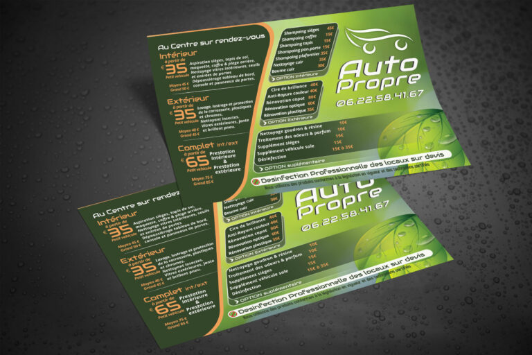 Exemple de communication visuelle sur un thème écologique « Le lavage et le nettoyage végétale des véhicules pour les particuliers et les professionnels ». L’objectif est de simplifier la présentation du large panel des prestations et les tarifs associés, proposés par le Centre Auto Propre.
